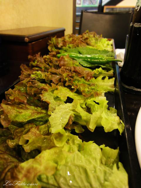 每家燒肉店必定附有的是無限供應的生菜、整條辣椒以及大片的紫蘇葉。